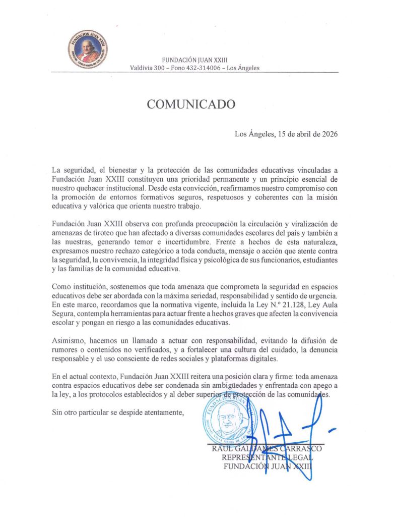 Nuestro Sostenedor ha compartido un comunicado enfocado en la seguridad, el bienestar y la protección de todas las comunidades educativas vinculadas a la Fundación Juan XXIII.